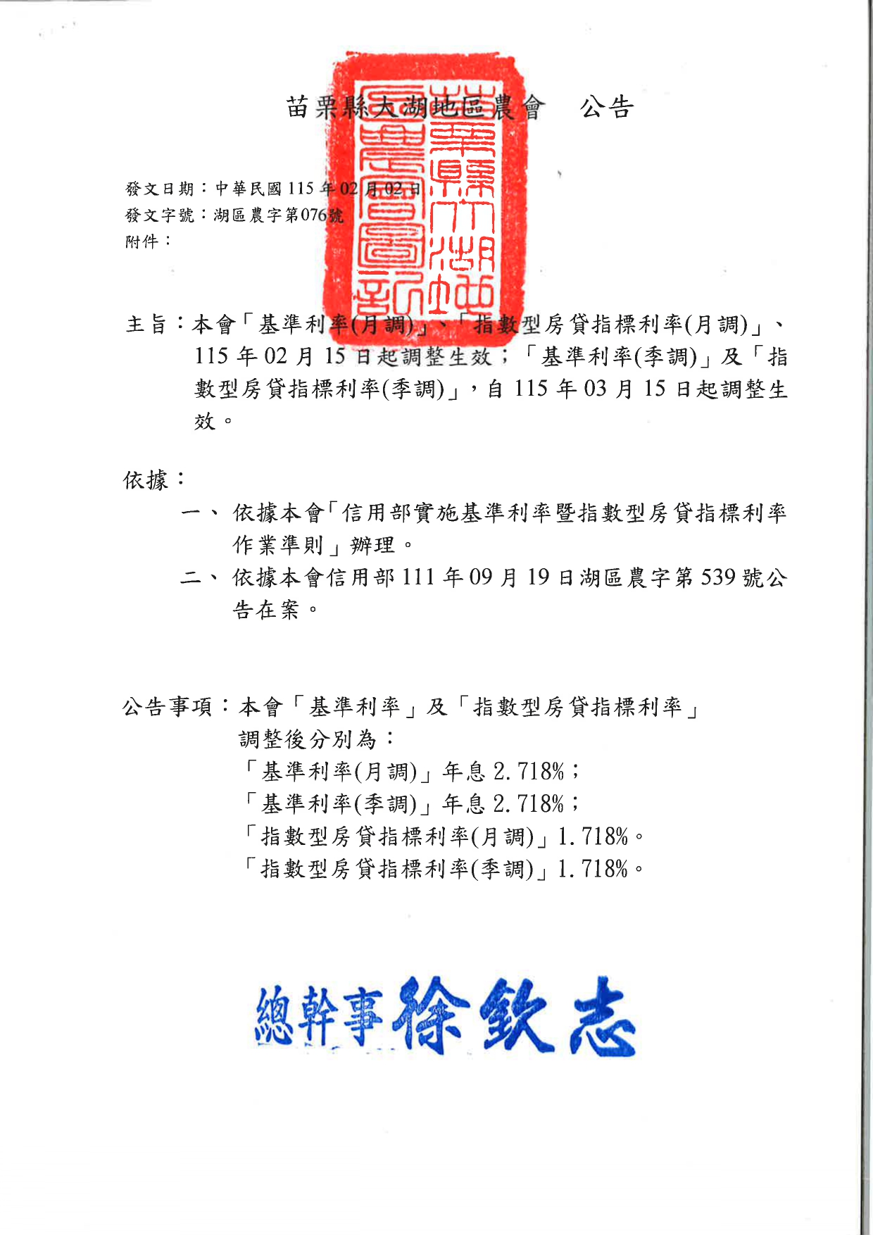 > 【放款】放款基準/指數利率公告-115.02.15實施
