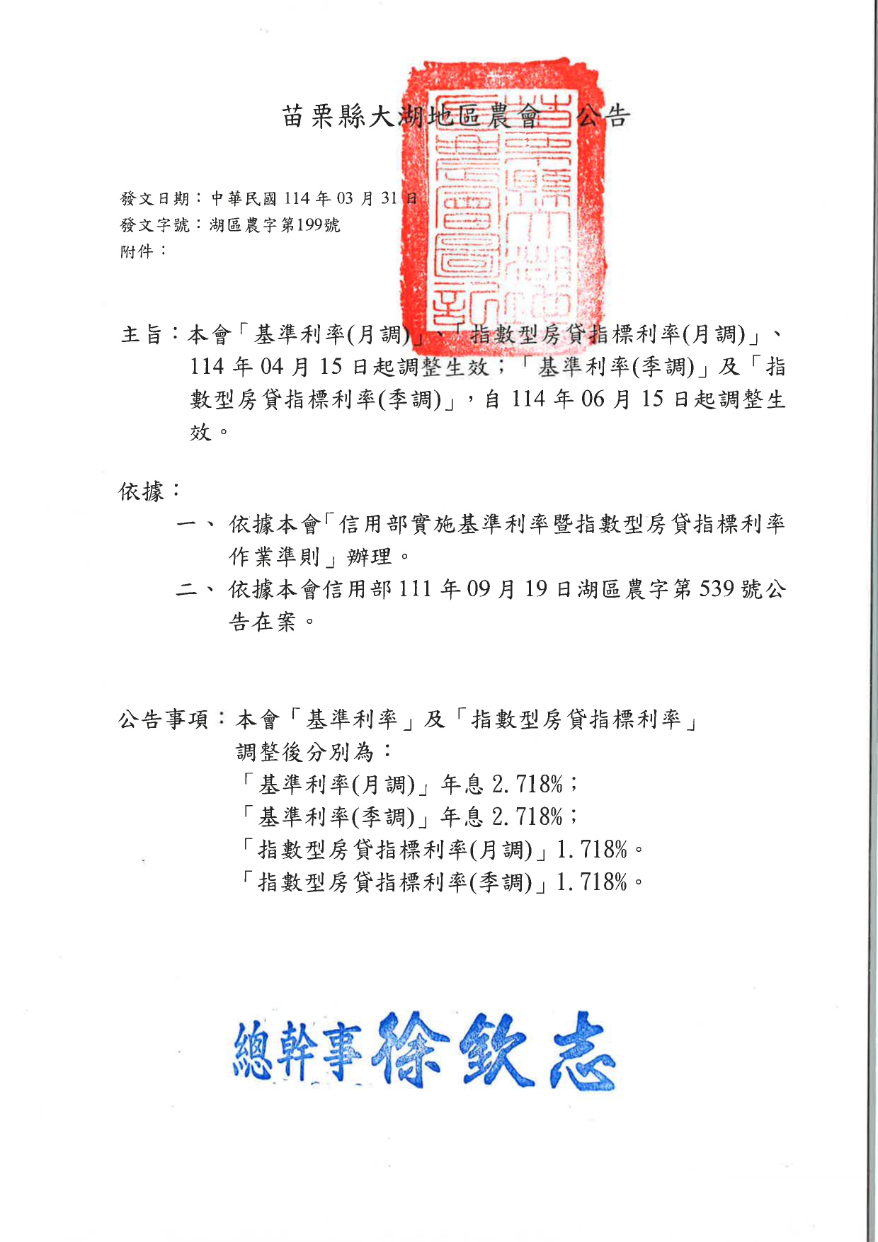首頁 ﹥ 最新消息 > 信用部 > 【放款】放款基準/指數利率公告-114.04.15實施 2025-03-31 相關連結:https://www.dahufarm.com/custom_136897.html 上一個 回列表 下一個