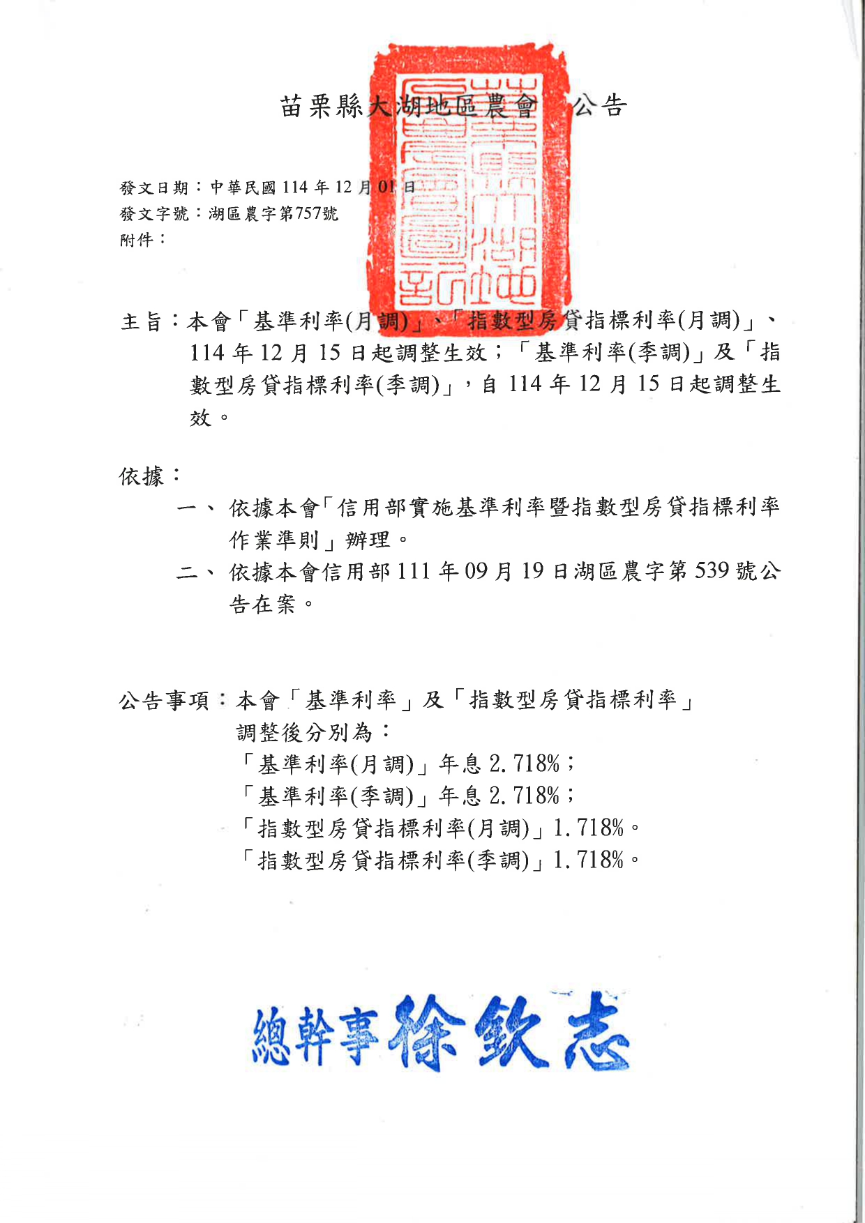 首頁 ﹥ 最新消息 > 信用部 > 【放款】放款基準/指數利率公告-114.12.15實施 2025-12-08 相關連結:https://www.dahufarm.com/custom_139491.html 回列表 下一個