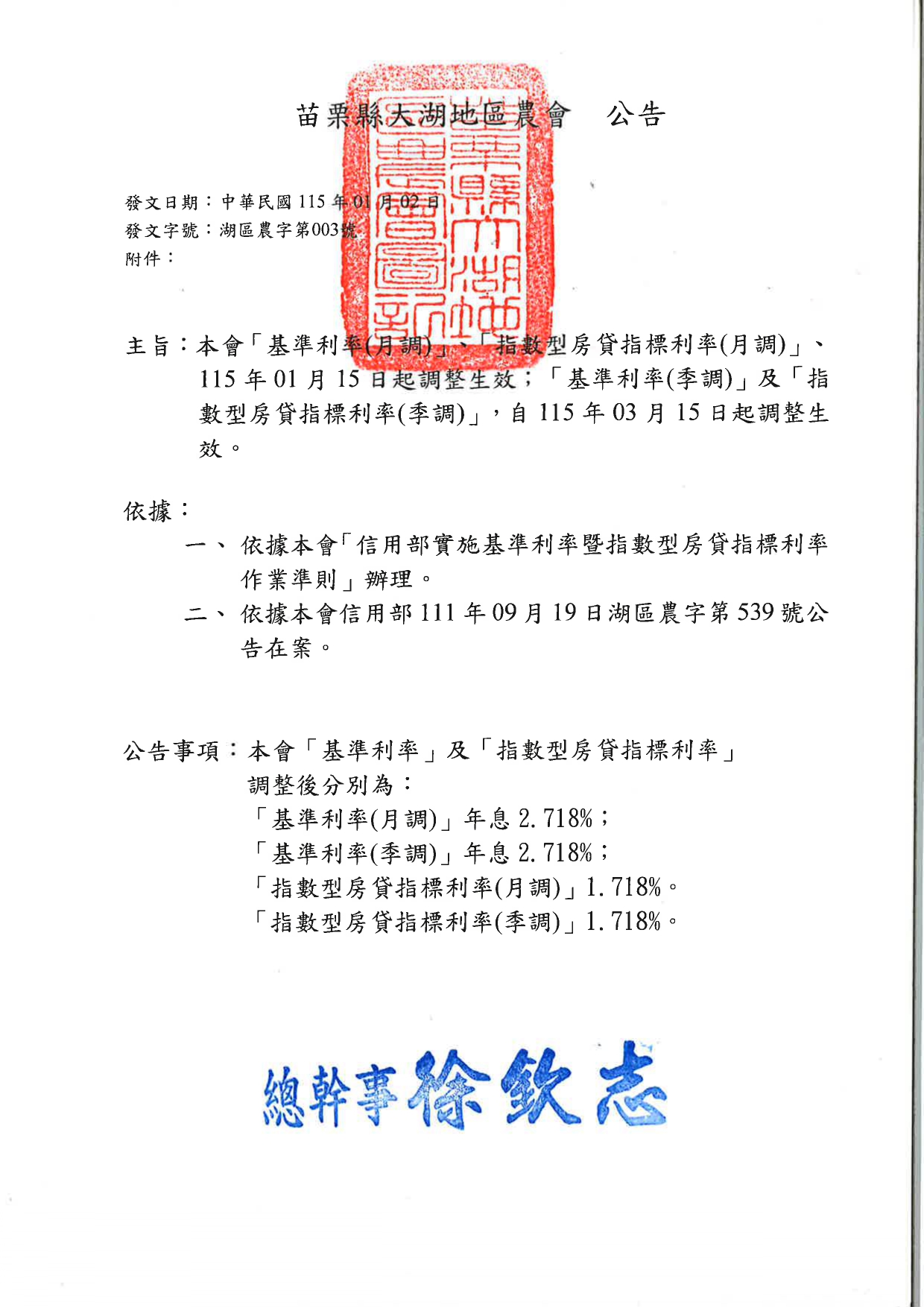 【放款】放款基準/指數利率公告-115.01.15實施